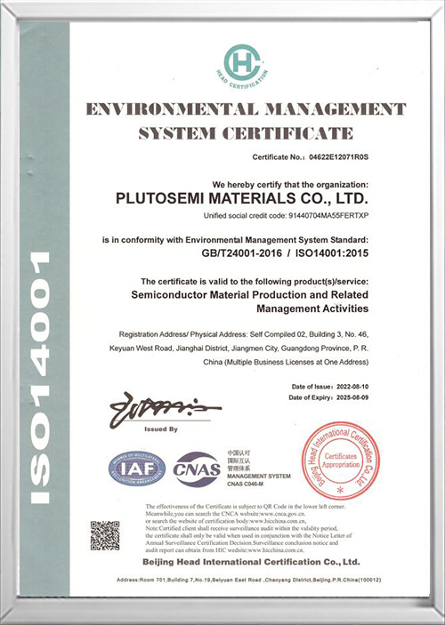 2022年8月,取得ISO14001:2015环境管理体系认证。